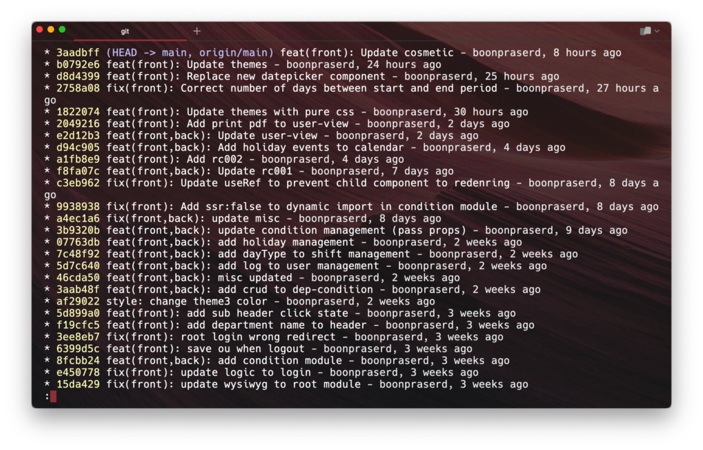 จริงๆแล้วสัปดาห์นี้ได้เรียนรู้อะไรเล็กๆน้อยๆอีกหลายอย่างสำหรับงานพัฒนาเว็บแอพพลิเคชั่น เอาไว้ถ้ามีโอกาสจะทะยอยเล่าให้ฟังต่อไปครับ ก่อนจบก็ขอเอา git log ของโปรเจ็คนึงมาให้ดูเป็นเครื่องยืนยันว่าช่วงนี้ทำงานจริงจังมาก 😸 (น่าจะอ่านเข้าใจเฉพาะสาย dev นะ)