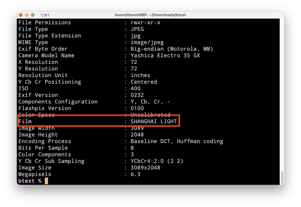 exiftool -Film='SHANGHAI LIGHT' YOUR_FILE_NAME.EXT